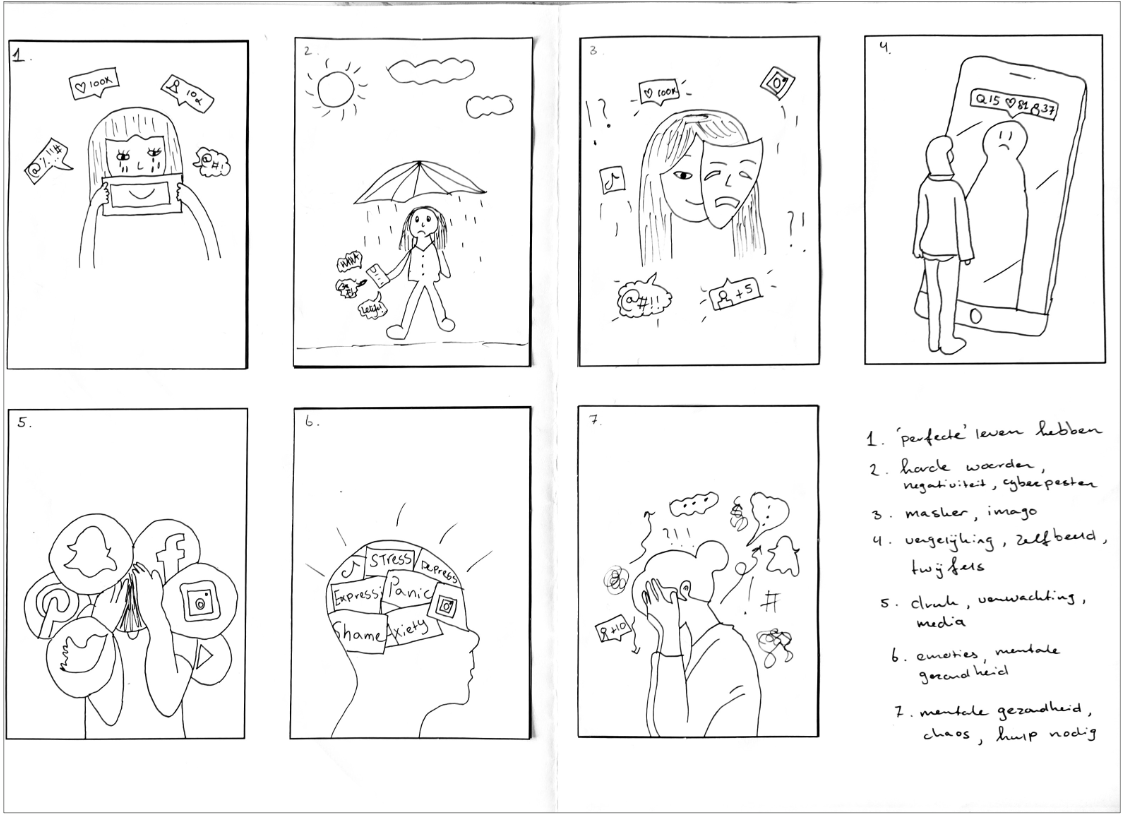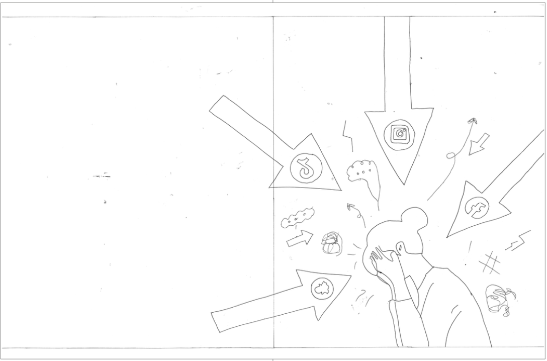 After completing the mind map research, we moved on to designing the cover of our magazine. This process started with a series of sketches. I first created seven small concept sketches and then selected one to develop into the final cover design. I chose the concept shown in the image.